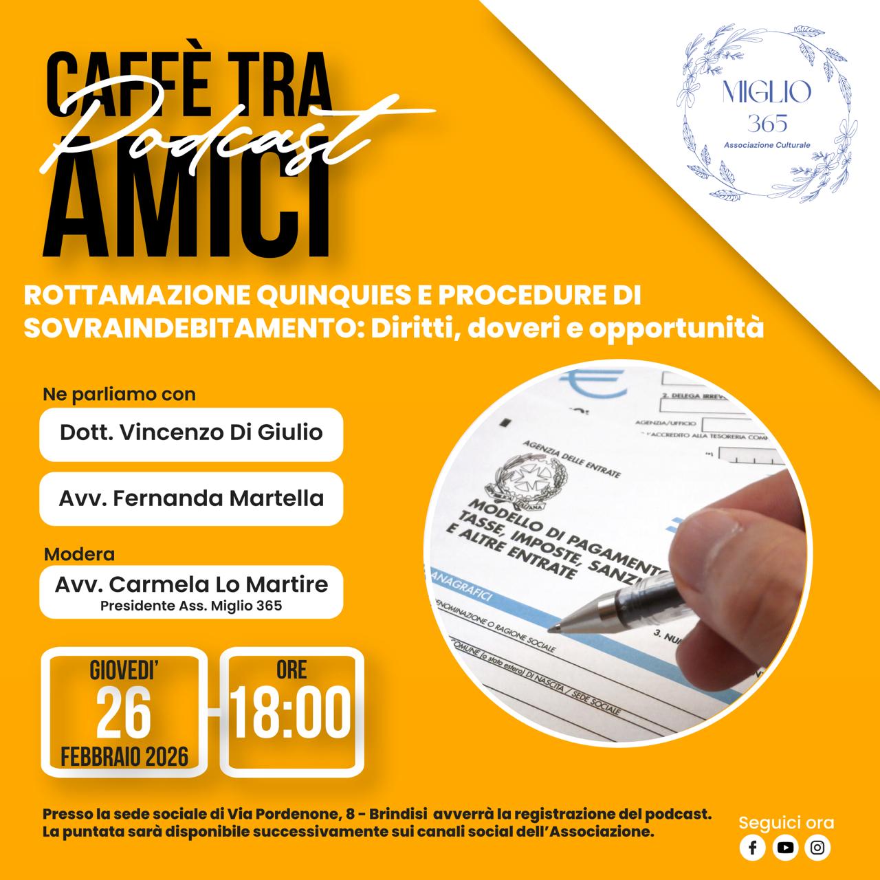 Giovedì 26 febbraio 2026, alle ore 18:00, l’Associazione Culturale MIGLIO 365 apre le porte della sua sede (Via Pordenone n. 8, Brindisi) per una nuova