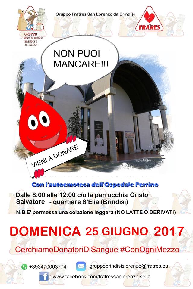 BRINDISI DONAZIONI SANGUE: FRATES SAN LORENZO ORGANIZZA PRESSO LA CHIESA CRISTO SALVATORE carmen0409 19 Giugno 2017