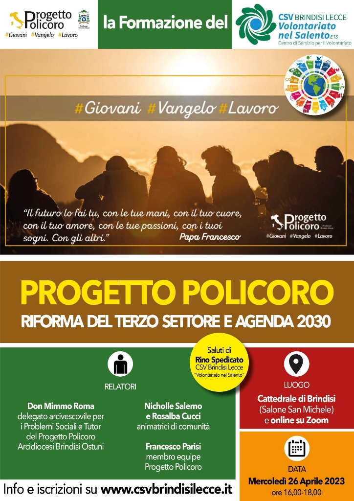 “Progetto Policoro, riforma del Terzo Settore e Agenda 2030”,il CSV propone incontro formativo mercoledì 26 aprile Il Centro Servizi per il Volontariato di Brindisi-Lecce “Volontariato