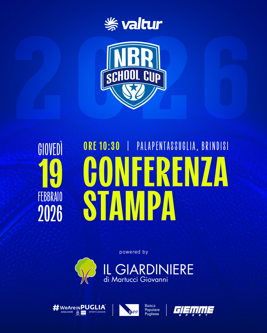 Giovedì 19 febbraio alle ore 10:30, presso la sala stampa del Palasport “E. Pentassuglia”, avrà luogo la presentazione della Valtur Brindisi ‘Il Giardiniere’ School Cup