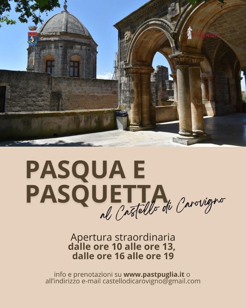 In occasione delle festività pasquali, il Castello di Carovigno sarà aperto al pubblico anche domenica5 aprile e lunedì 6 aprile, offrendo a cittadini e visitatori