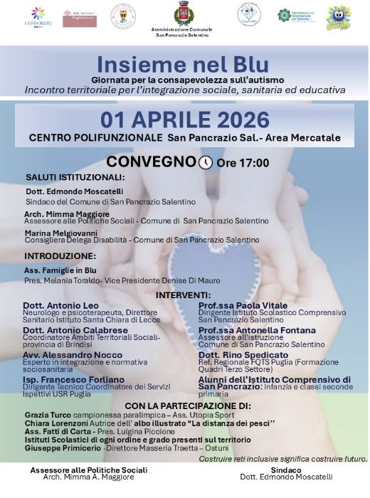 San Pancrazio Salentino – Si svolgerà mercoledì 1 aprile 2026 la Giornata per la consapevolezza dell’autismo “Insieme nel Blu”, iniziativa realizzata dal Comune di San Pancrazio Salentino, con il pieno sostegno del Sindaco Dott. Edmondo Moscatelli e dell’Amministrazione comunale e promossa dall’Assessore alle Politiche Sociali, l’Arch. Mimma Maggiore.