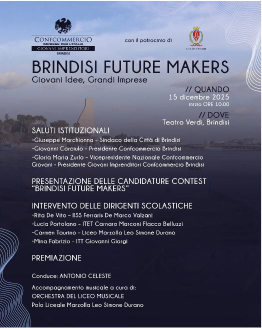 Brindisi, 15 dicembre 2025 — Si terrà lunedì 15 dicembre alle ore 10:00, presso il Teatro Verdi di Brindisi, la giornata conclusiva della prima edizione di “Brindisi Future Makers – Giovani Idee, Grandi Imprese”, il contest ideato e lanciato lo scorso 23 ottobre dal Gruppo Giovani Imprenditori Confcommercio Brindisi per valorizzare il talento e la creatività del territorio.