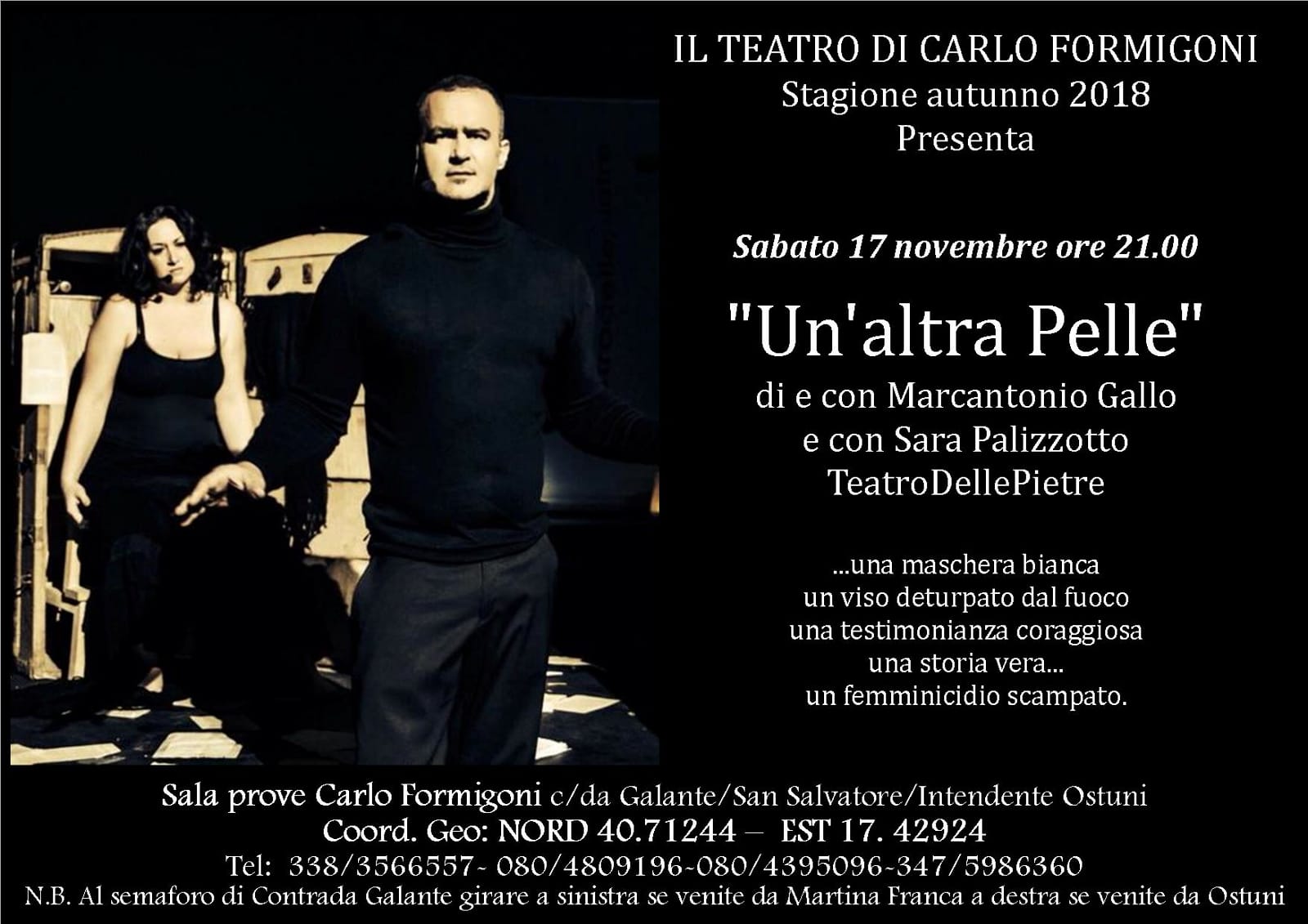 SABATO “UN’ALTRA PELLE”, CON MARCANTONIO GALLO E CON SARA PALIZZOTTO. “TEATRO DELLE PIETRE” 14 Novembre 2018