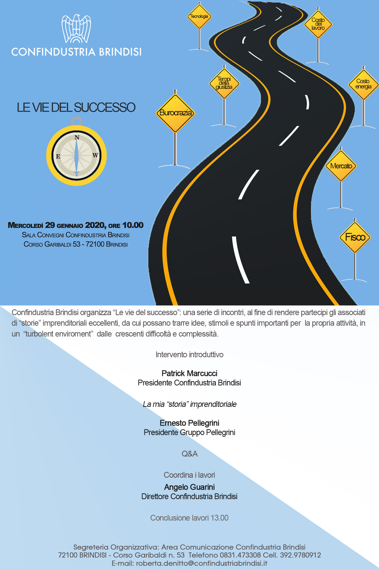 Domani, mercoledì, 29 gennaio, nella sede di Confindustria Brindisi in corso Umberto, si terrà il Workshop “LE VIE DEL SUCCESSO”, dedicato alle storie di associati eccellenti da cui si possa trarre esempio.